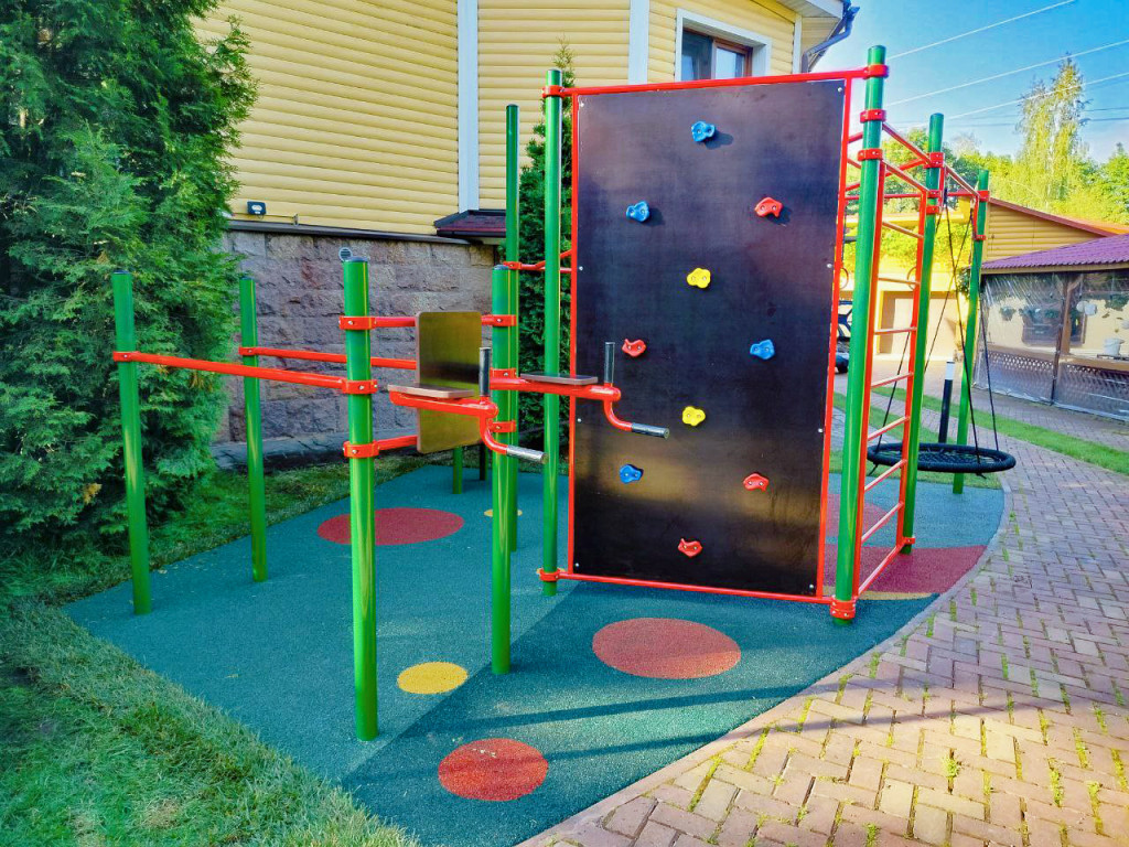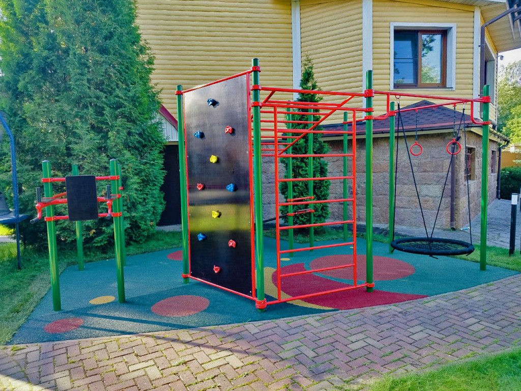 Все конструкции окрашены в цвет, выбранный клиентом. Спортивная зона установлена на бесшовное резиновое покрытие с декоративными кругами – не только безопасно, но и эстетично. Такое решение позволило объединить спорт, игру и комфорт.