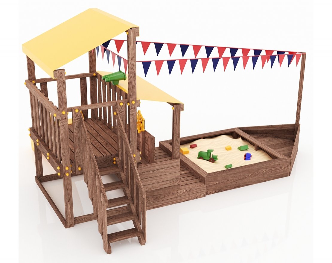Детская песочница-кораблик, включающая в себя штурманскую рубку и капитанский мостик с горкой с высоты 900 мм с флажками, а также две крыши закрытые тентом, чтобы можно было отправиться в дальнее плавание даже под дождем.