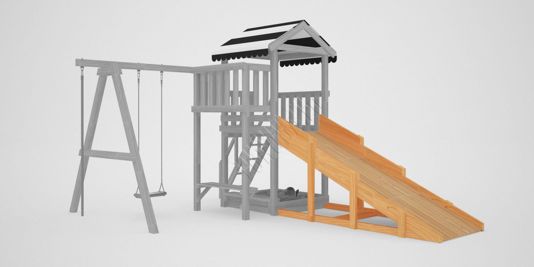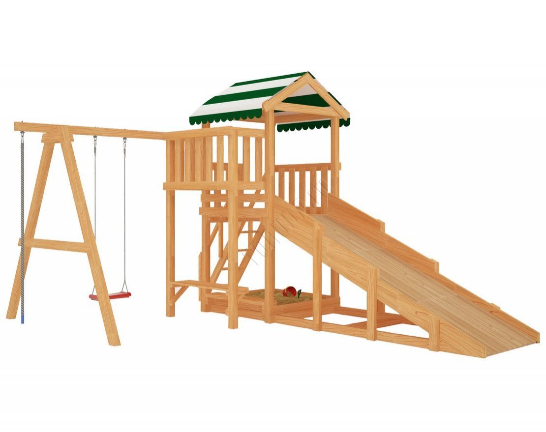 Всесезонная модель Гарда 1 обладает натуральным цветом дерева без покрытия и модульной конструкцией. Одновременно на площадке могут играть несколько детей. Основа конструкции – игровая башня с балкончиком и яркой пластиковой горкой.