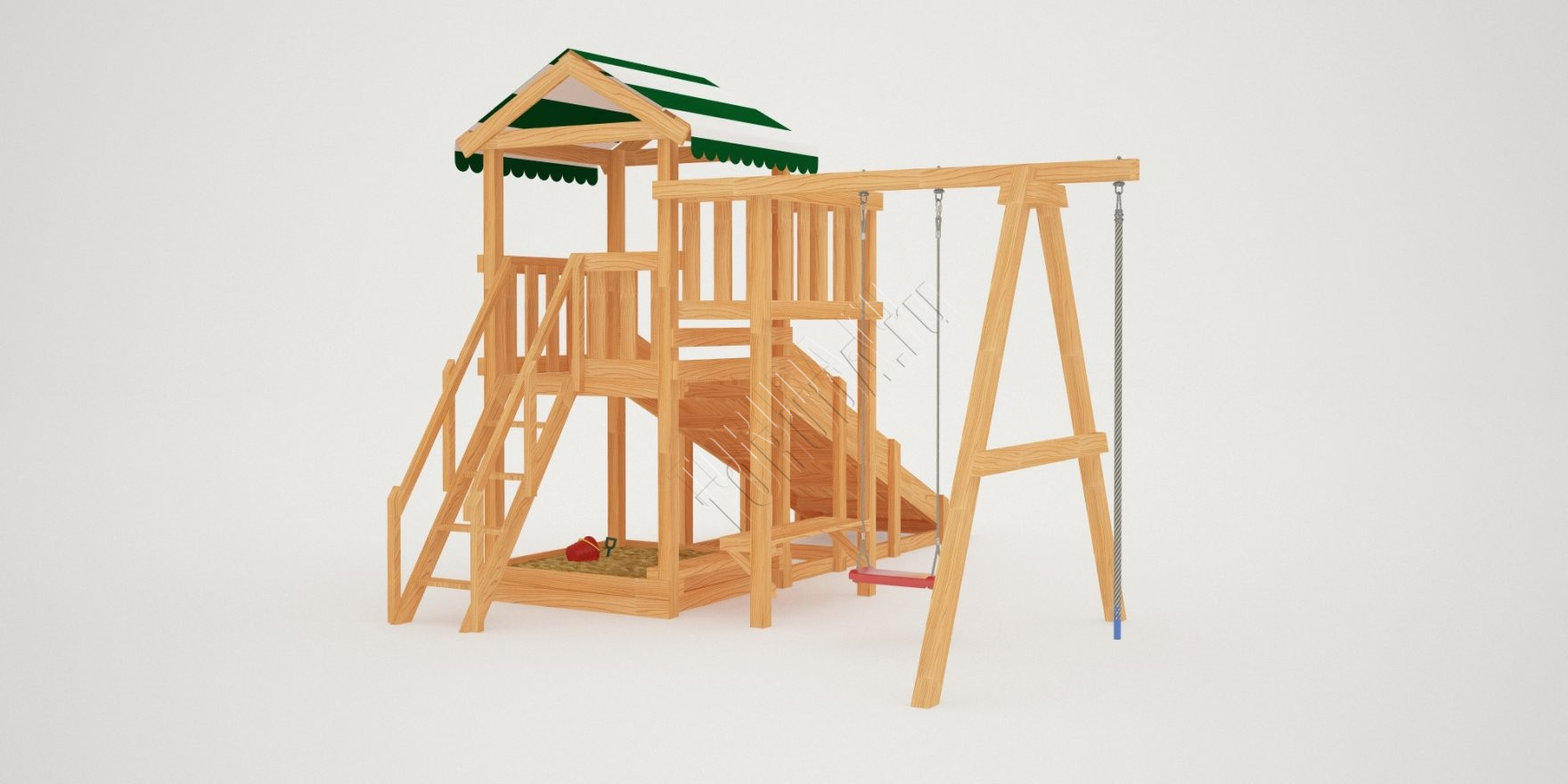 Также в модели есть еще один дополнительный канат для полноценного лазания – он расположен слева от качелей. Для любителей более спокойных игр предусмотрена песочница с удобной лавочкой для игральных принадлежностей. ВАЖНО: Комплекс поставляется без окрашивания и отверстий для крепежа, но его сборка, как правило, не представляет трудности для опытного хозяина. Для разметки отверстий в комплект входит лекало.