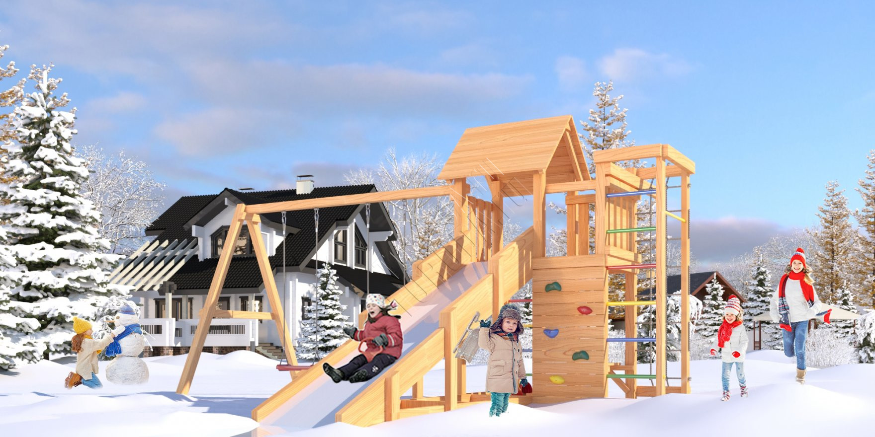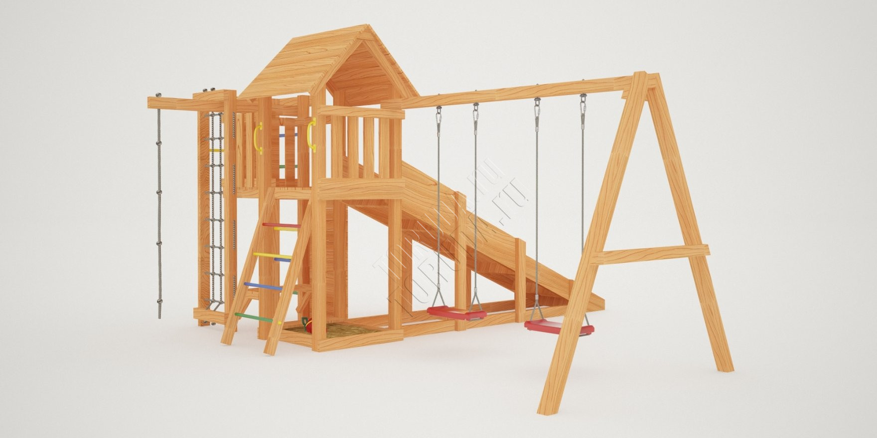 Комплекс безопасен – конструкция, качество древесины и подвижных элементов соответствуют ГОСТ. Основным материалом является экологичный клееный брус, балки которого отшлифованы и имеют закругленные края.
