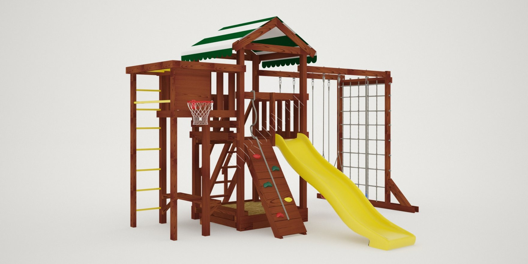 Укреплять мышечный каркас нужно с детства, бросая мяч в баскетбольное кольцо, вися на турнике и кольцах, карабкаясь по шведской стенке, канату, сетке-лазалке. Все это многообразие спортивных снарядов присутствует в Гарда 4 Бри. Для большей радости качели «Лодочка» и «Люкс» со спинкой.